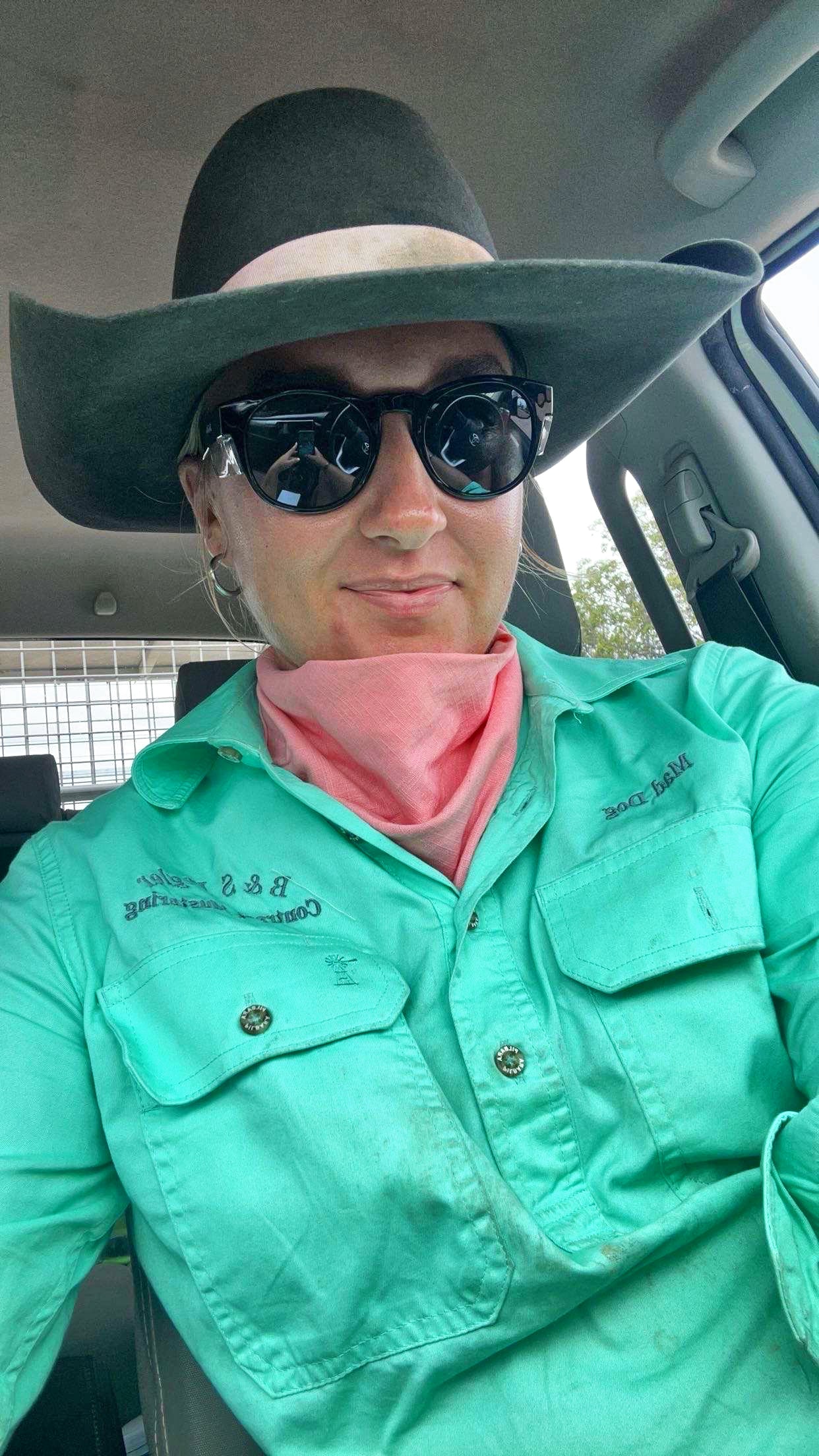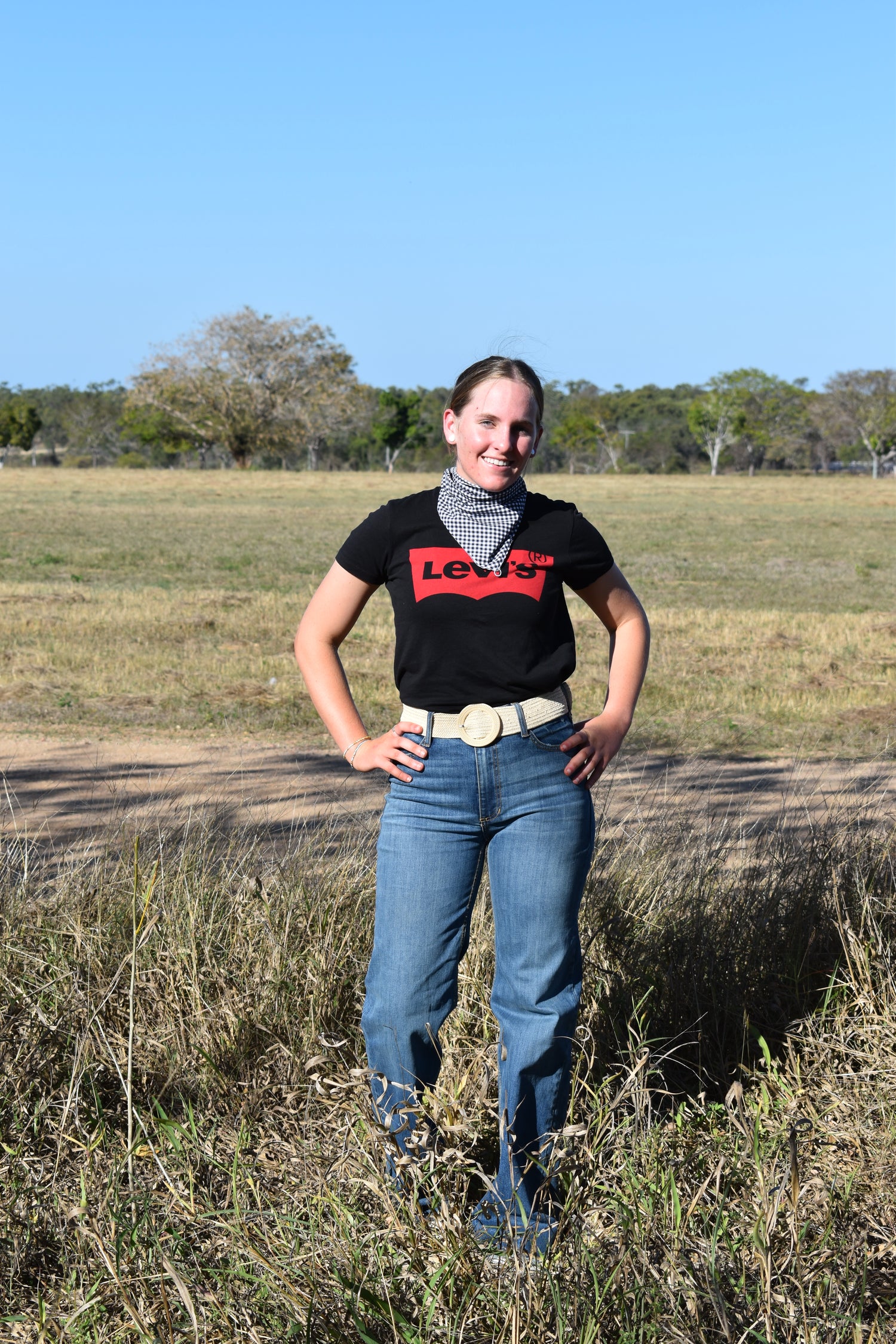 Erin is wearing one of our black and white check neck scarves! she has been with us since day one and will continue with us for 2025!
